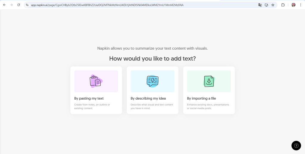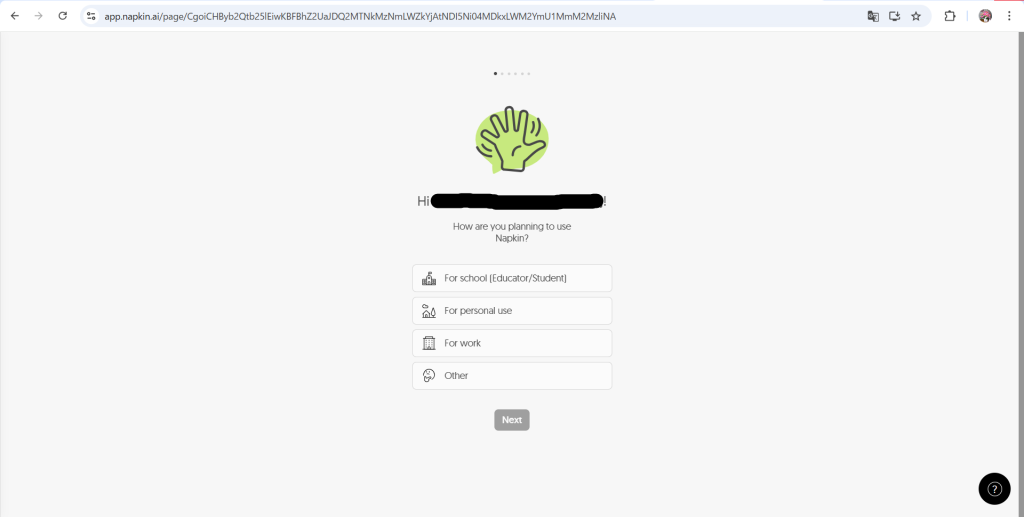 こちらのURLからサイトに飛ぶと、上記のような画面が表示されます。右上の「Get Napkin Free」をクリックして使用を開始します。なお、開始時にGoogleやAppleなどの何らかのアカウントにログインする必要があるため注意してください。